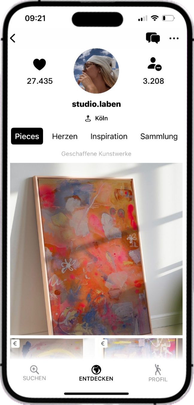 Zum Beispiel kann Ana aus Stuttgart nach minimalistischen & blauen Malerei-Kunstwerken suchen, die innerhalb ihrer Preisvorstellung liegen. Wenn dein Piece auf die Suche passt, wird es ihr angezeigt und sie findet genau das, was sie sucht.