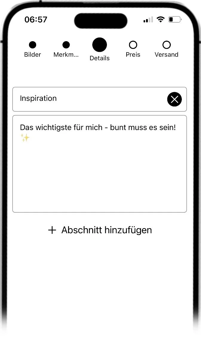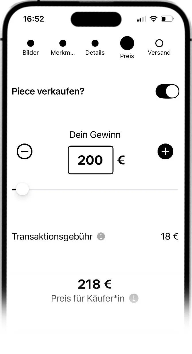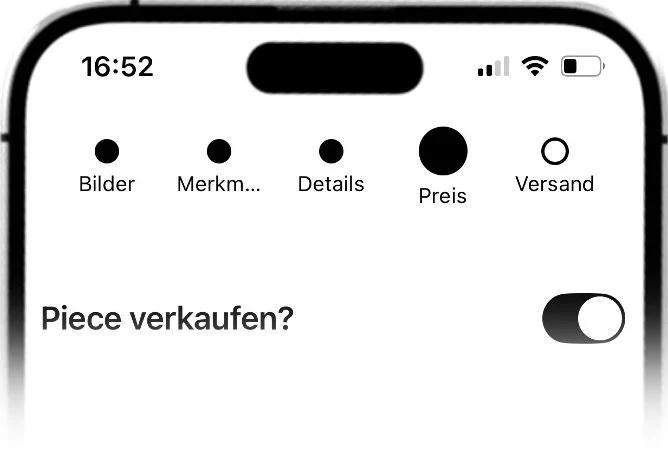Beim Upload deines Pieces hast du die volle Kontrolle: Bestimme Bilder, Videos, Merkmale, Texte, Preis & Versandoptionen.